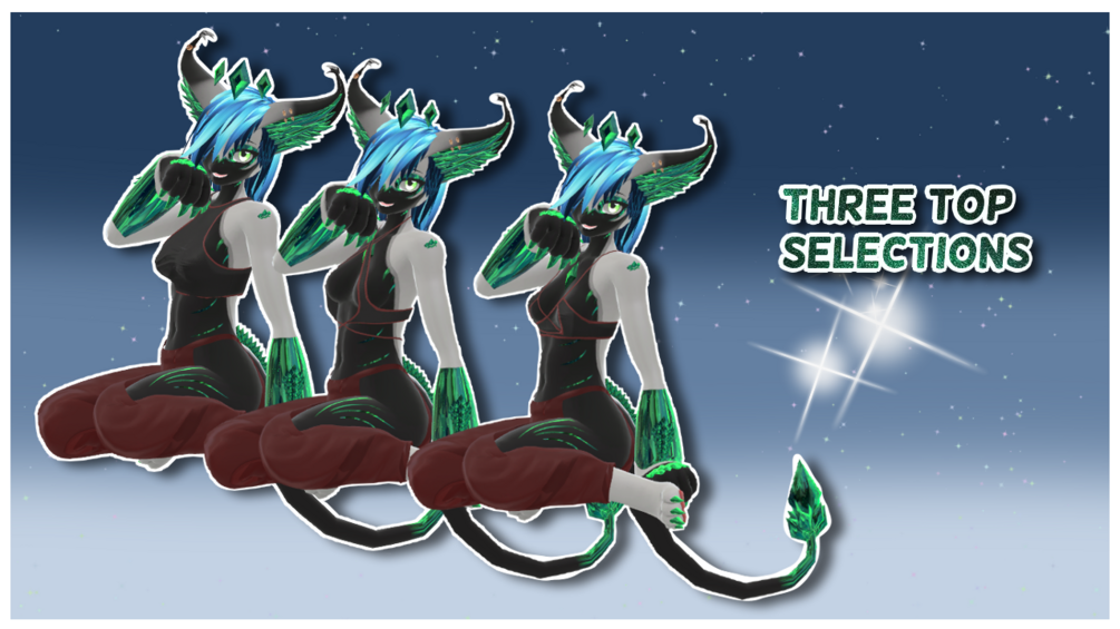 Emerald comes with three tops and three textures for them, a pair of pants with three textures, a harness with bells on it which are all weight painted also has four textures, a head pat and noose boop collider, a hue shift for the crystals and the ability for others to grab the crystals on your head and move them around.